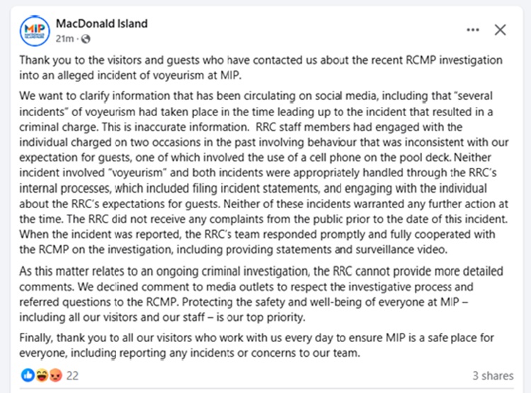 Amid the social media outcry, the RRC issued a public statement clarifying that initial information provided by law enforcement was slightly inaccurate. “[there were] two occasions in the past involving behaviour that was inconsistent with our expectation for guests, one of which involved the use of a cell phone on the pool deck. Neither incident involved “voyeurism” and both incidents were appropriately handled through the RRC’s internal processes, which included filing incident statements, and engaging with the individual about the RRC’s expectations for guests,” the statement read.
